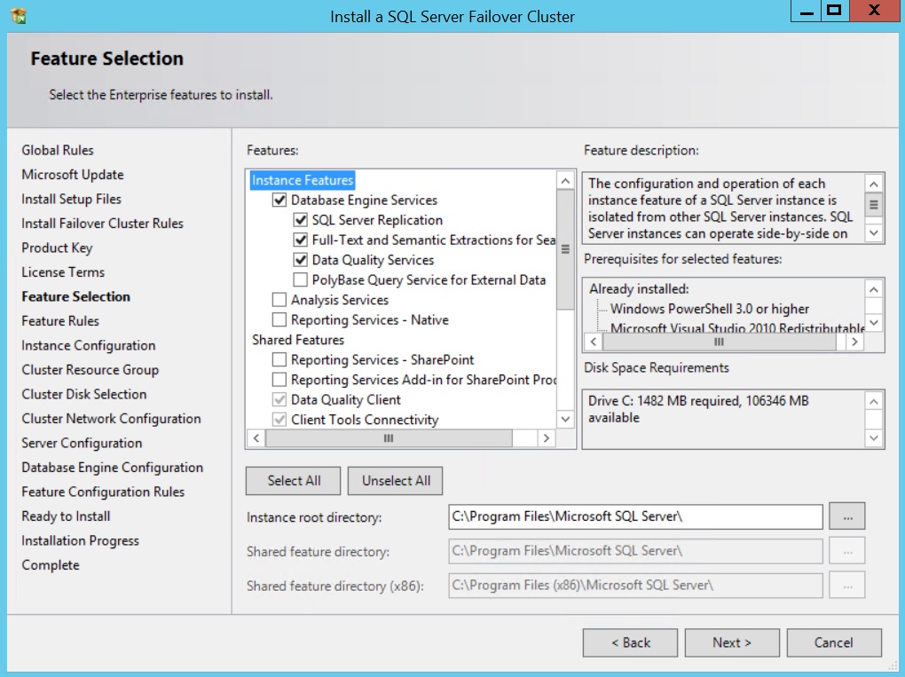 Database Engine Services (SQL Server Replication, Full-Text Search and Data Quality Services are automatically selected)