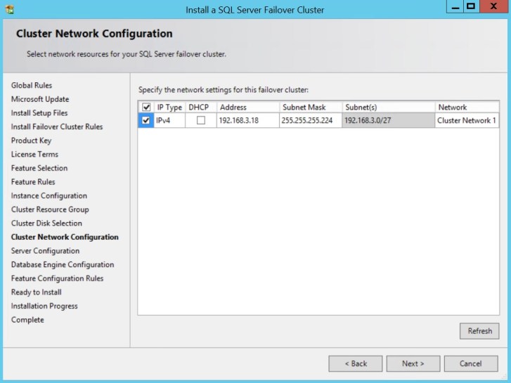 Uncheck DHCP and enter the virtual IP address for this instance. You may need to enter the Subnet Mask if this is the very first installation of sql on this box. Leave the Network name as is.
