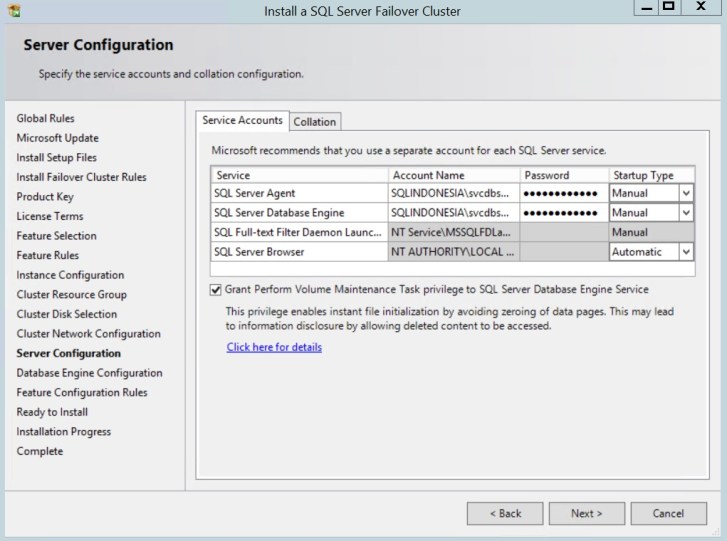 Enter an account and password for each service. Leave startup type as manual because it is a cluster.